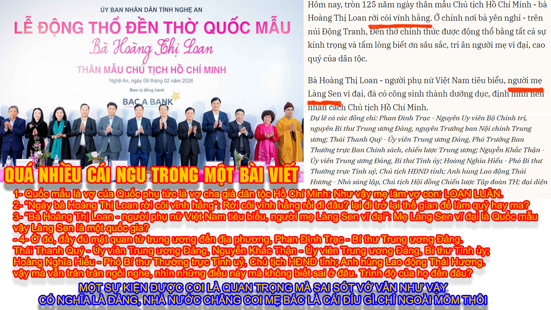 Nếu bà là Quốc mẫu (mẹ của một quốc gia), thì chẳng lẽ “Làng Sen” là một quốc gia riêng biệt? Cách dùng từ ngữ địa phương hóa một cách vô tội vạ để gán ghép với các danh hiệu cao quý nhất cho thấy sự lạm dụng ngôn từ đến mức rẻ rúng.