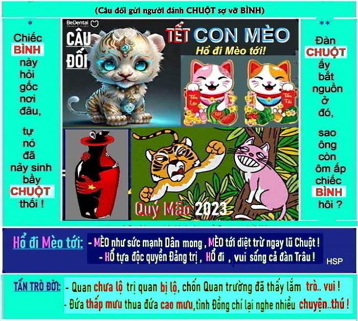 Câu đối Tết Quý Mão 2023 Hà Sĩ Phu Câu đối Tết Quý Mão 1/ LÒNG CHÂN-THIỆN ĐÓN XUÂN : – Thuở THIỆN- ÁC đan cài, TẾT đến mong chờ “vua THIỆN Ý ” ! – Thời GIẢ-CHÂN lẫn lộn, XUÂN về ngóng đợi “chúa CHÂN TÂM” ! 2/ HỔ ĐI MÈO TỚI : – MÈO như sức mạnh Dân…