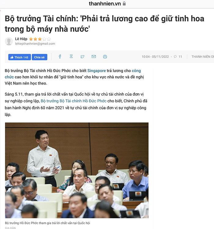 Đỗ Duy Ngọc 15-11-2022 Trong một buổi trả lời chất vấn mới đây tại Quốc hội, Bộ trưởng Bộ Tài chính Hồ Đức Phớc cho biết, Singapore trả lương cho công chức cao hơn khối tư nhân để “giữ tinh hoa” cho khu vực nhà nước và đề nghị Việt Nam nên học theo. Với tư cách công dân hạng…