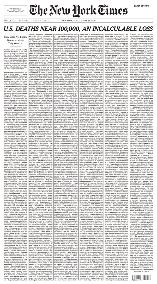 Trang mặt của tờ The New York Times đưa một sự thật đau buồn về sự tàn phá của coronavirus gây cho nước Mỹ trong mấy tháng qua. Số báo ngày Chủ Nhật 24/5, có lẽ từ rất nhiều năm đây là lần đầu tiên trang mặt của tờ The New York Times không có hình ảnh, chỉ có chữ…