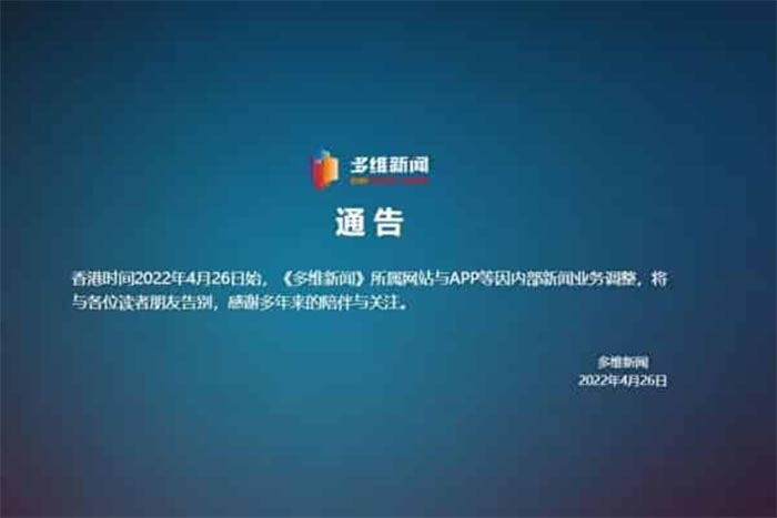 Lúc 4h chiều ngày 26/4, trang tin Duowei News có trụ sở chính tại Bắc Kinh bất ngờ thông báo sẽ ngừng hoạt động. Hầu hết các nhân viên của Duowei sẽ bị sa thải, và một số ít sẽ được chuyển sang tờ HK01. Duowei được coi trang tin mang màu sắc phe phái cựu lãnh đạo Đảng Cộng…