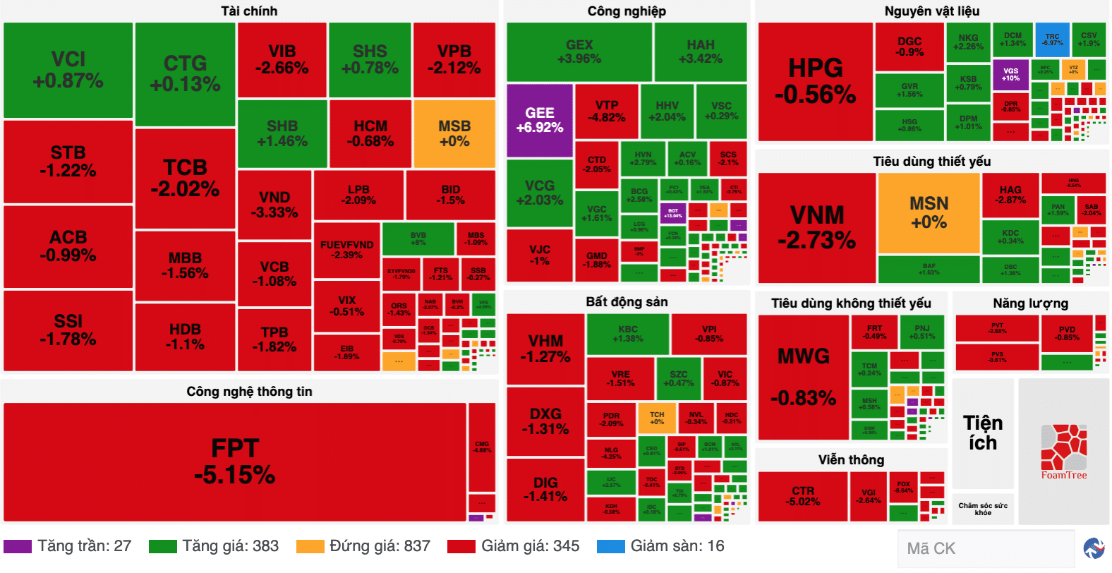 Kết thúc phiên giao dịch, VN-Index giảm 12,02 điểm (-0,95%), về mức 1253,03 điểm; HNX-Index tăng 0,48 điểm (+0,22%), lên mức 223,49 điểm. Thanh khoản đạt 12,8 ngàn tỷ đồng với sắc đỏ nghiêng về nhiều cổ phiếu lớn. Khối ngoại quay trở lại bán ròng hơn 1500 tỷ đồng trên sàn HOSE. Thị trường ngay từ đầu phiên sáng…
