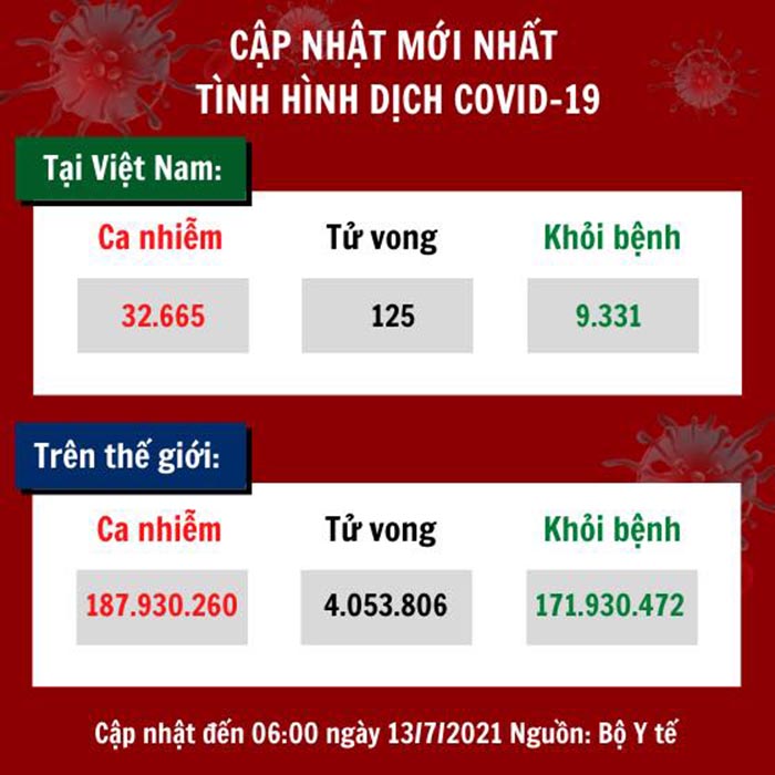 Minh Sang Thêm 2.383 ca nhiễm COVID-19 VnExpress – Tính đến tối ngày tối 12/7 (giờ VN) Bộ Y tế ghi nhận 609 ca dương tính COVID-19, gồm 603 ca trong nước và 6 ca nhập cảnh được cách ly ngay. 609 ca mới từ số 31591-32199. Trong đó, 603 ca ghi nhận tại: TP.HCM (341), Bình Dương (128), Khánh…
