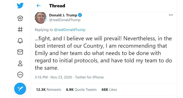Người Việt Trong tin nhắn gởi ra chiều Thứ Hai, 23 Tháng Mười Một, Tổng Thống Donald Trump cho biết: “Vì lợi ích quốc gia, tôi yêu cầu Giám Đốc Emily Murphy và đội ngũ của bà làm những gì cần thiết theo các bước quy định, và tôi cũng cho các nhân viên trực thuộc hành động tương tự.”…