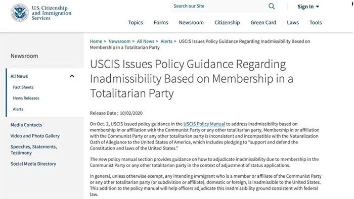 Tiêu Nhiên Từ ngày 2/10/2020, Sở Di trú Mỹ đã chính thức thực hiện các quy định cấm các đảng viên Đảng Cộng sản Trung Quốc (ĐCSTQ) nộp đơn xin nhập cư hoặc thẻ xanh tại Mỹ. Vào ngày 2/10/2020, Sở Nhập tịch và Di trú Mỹ đã thông báo trên trang web chính thức rằng đã ban hành một…