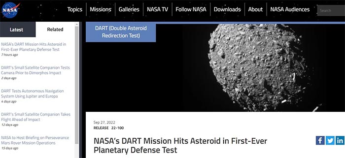 Sáng ngày 27/9 (theo giờ Việt Nam), Cơ quan Hàng không Vũ trụ Mỹ (NASA) thông báo trên trang web chính thức rằng tàu vũ trụ thực hiện thử nghiệm chuyển hướng tiểu hành tinh kép (DART) đã hoàn thành sứ mệnh đâm vào tiểu hành tinh Dimorphos. Đây là lần đầu tiên một tàu vũ trụ của NASA đâm…
