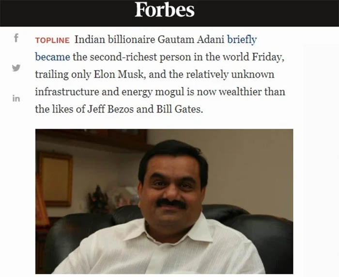 Tỷ phú Gautam Adani (Ấn Độ) đã vượt qua ông Bernard Arnault để trở thành người giàu thứ 2 thế giới, xếp sau tỷ phú Elon Musk (CEO SpaceX và Tesla), theo hãng tin Forbes. Cụ thể, ông Adani sở hữu khối tài sản ròng trị giá 154,9 tỷ USD, vượt qua người xếp sau là ông Arnault (153,4 tỷ…