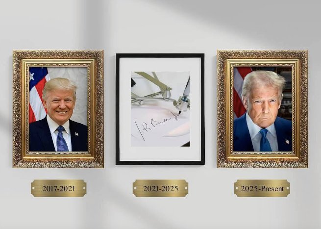 JB Nguyễn Hữu Vinh 19-3-2025 Một loại hình ảnh các đời Tổng thống Mỹ treo trên tường tại phòng bầu dục, tòa Bạch Ốc. Đương kim Tổng thống Hoa Kỳ Donald Trump đã bỏ ảnh Tổng thống Joe Biden, thay bằng một hình ảnh cây bút ký tự động. Thay cho bõ ghét, chứ chẳng lẽ Biden buồn ngủ lại…