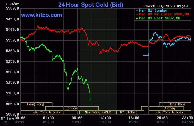Mỗi ounce vàng hiện mất hơn 250 USD, trong khi chỉ số DJIA của chứng khoán Mỹ giảm trên 1,000 điểm. Sau khi nhích nhẹ sáng 3/3, giá vàng thế giới giao ngay bắt đầu giảm mạnh từ chiều. Hiện tại, giá mất tới 252 USD, xuống 5,067 USD. Thị trường đi xuống khi đôla Mỹ tăng giá. Dollar Index…