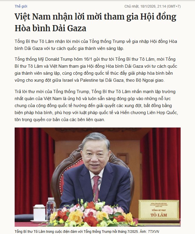 Nguyễn Ngọc Như Quỳnh 18-1-2026 Vậy là ngân sách Việt Nam chuẩn bị bỏ ra 1 tỷ USD để mua ghế trong Hội đồng Hòa bình dải Gaza hả? Hay VinGroup sẽ tài trợ gói này? Hôm qua có tin: Trump ra giá 1 tỷ USD cho ghế “Hội đồng Hòa bình” ở Gaza. (Tổng hợp từ Bloomberg, ngày 17/1/2026) Theo các…
